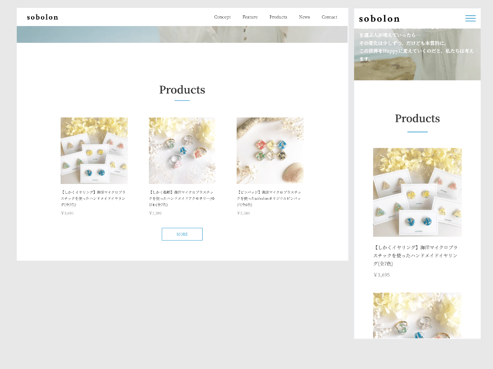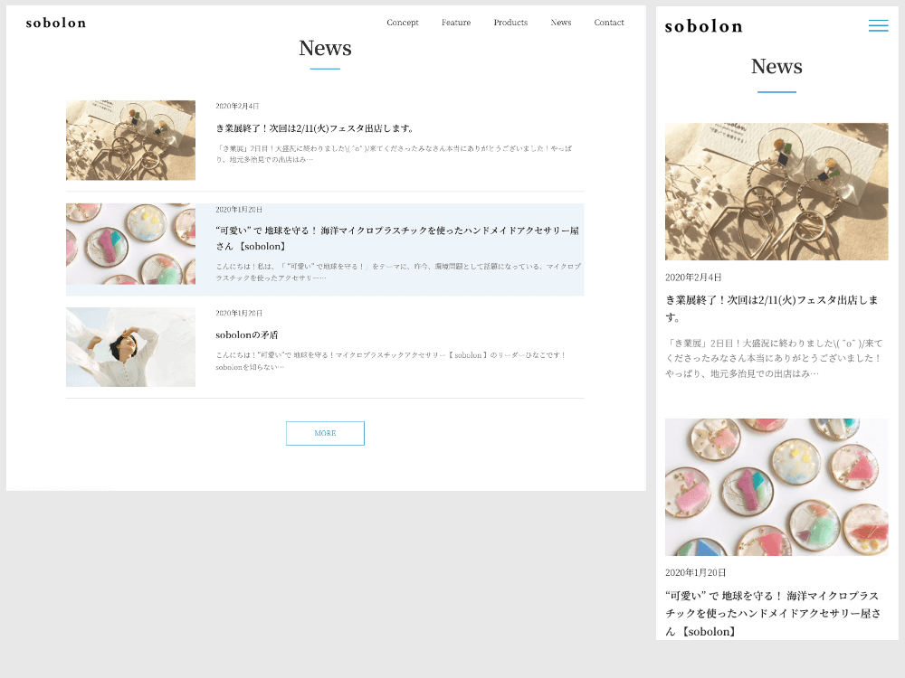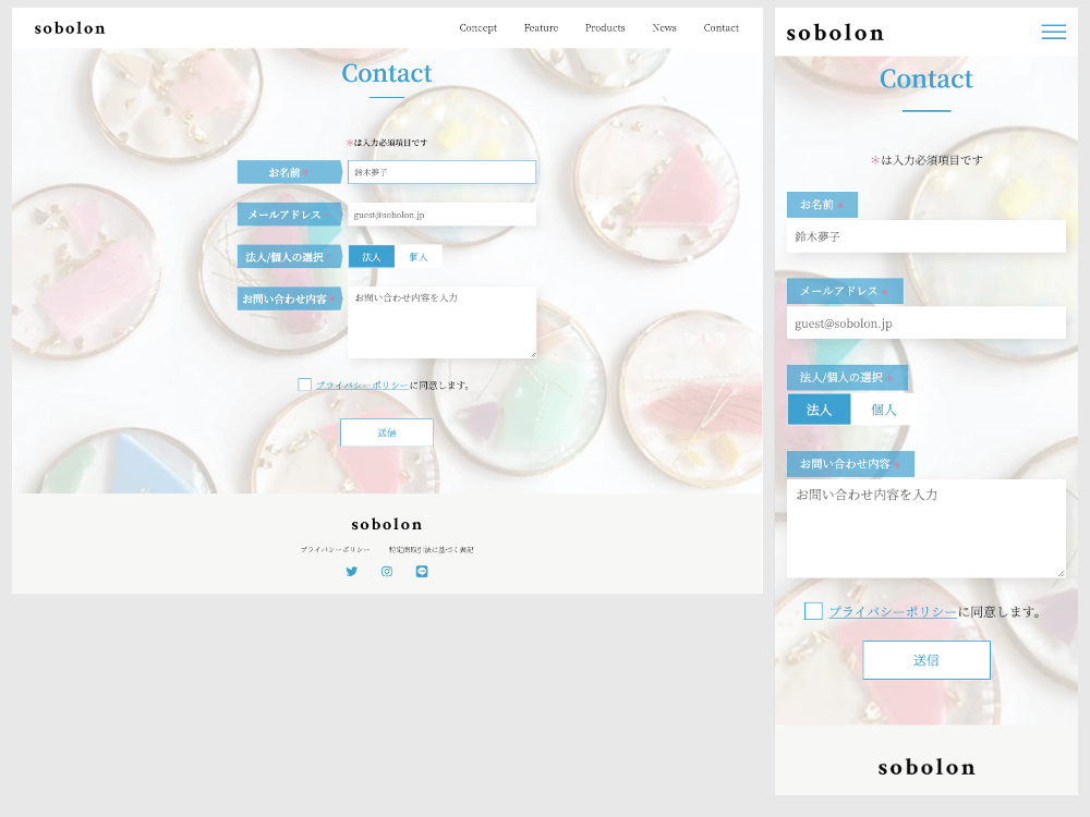レスポンシブ対応は主にdisplay flexで対応。スマフォ表示時のヘッダーメニューのハンバーガーアイコン〜Drawerメニュー表示切り替え部分やスムーススクロールはjQueryを使用。その他各リンク部分やコンタクトフォームのhoverやfocus時の強調表示を追加。